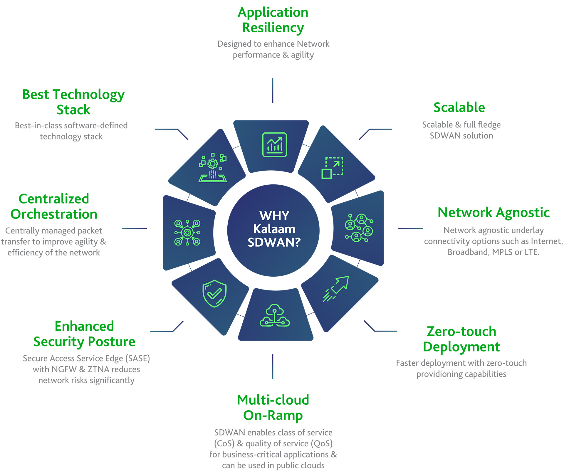 Kalaam Managed SDWAN is our next-gen software-defined WAN platform designed to deliver integrated cloud, networking, and security services. Our industry-agnostic solution enables Enterprises to transform legacy WANs to achieve better business agility, branch modernization, branch security, application performance optimization, multi-cloud access & TCO advantages. Our automated & fully orchestrated WAN infrastructure offers reliable connectivity connecting any user to any application with integrated capabilities for multi-cloud, security, unified communications & application optimization.