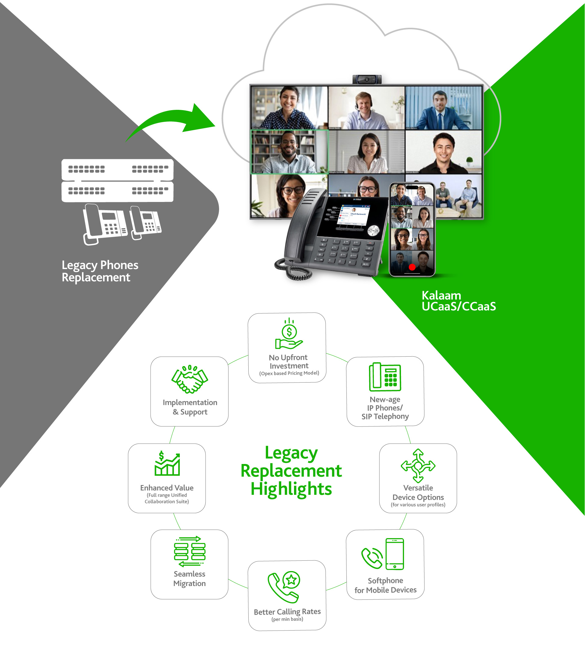 As a valued customer, we want to ensure that you have the best tools available to support your business needs in UCaaS, CcaaS and Collaboration suites domain. If you are using a legacy PBX/Telephony system that is at the end of its life or obsolete or older than five years, we have an exciting news for you! Kalaam Telecom is currently running Legacy Replacement campaign, allowing you to trade-in your legacy/obsolete/retired equipment towards our cutting-edge UCaaS/CCaaS solution powered by locally hosted world leading OEM.